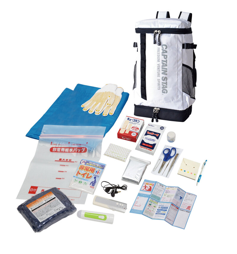 | ■セット内容 | リュック(500×280×150mm)・コンパクトFMラジオ・ハンディライト・シュラフ・非常用給水バッグ5L・非常用トイレ・防寒シート・すべり止め手袋・ブルーシート2畳用・付箋メモ・ボールペン・救急絆創膏2サイズ40枚入・ガーゼ・包帯・ハサミ・ピンセット・耳かき・毛抜き・ポケットティッシュ・防災ガイド |