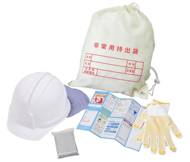 防災用ヘルメット(たれ覆い付)・チェックリスト付非常袋・防寒シート・すべり止め手袋・防災ガイド