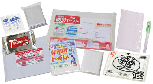 非常時に帰宅できない場合の携帯用支援セットです。ソフトバッグ入りで携帯しやすく、台紙には緊急時の連絡、応急手当の方法などを掲載しています。