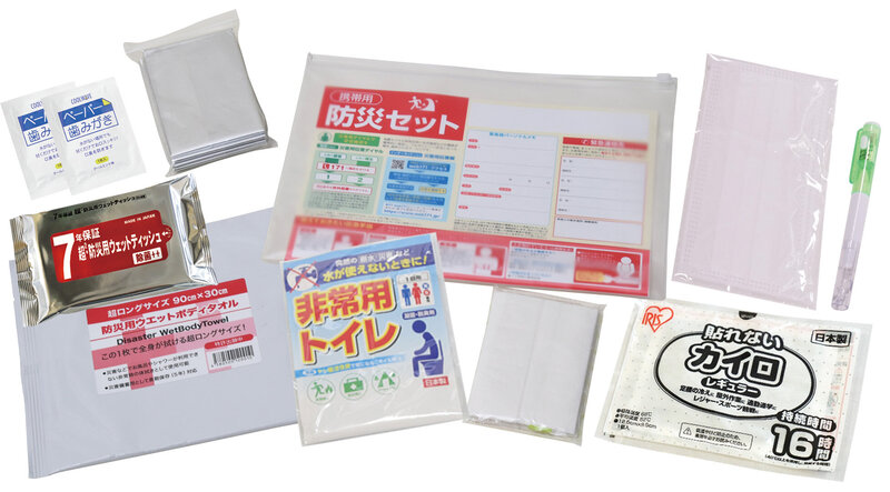 A4ソフトバッグ・ホイッスル付ライトペン・非常用トイレ・防災用ウエットティッシュ・防災用ウエットボディタオル・防寒シート・カイロ・マスク・ポケットティッシュ・ペーパー歯磨き2包