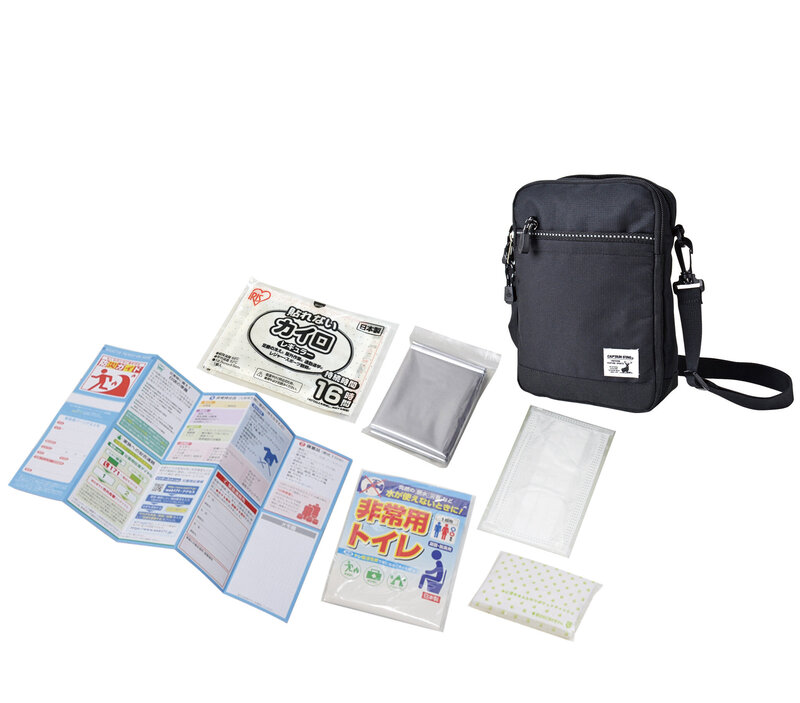 | ■セット内容 | ショルダーバッグ・非常用トイレ・防寒シート・カイロ・マスク・ポケットティッシュ・防災ガイド |