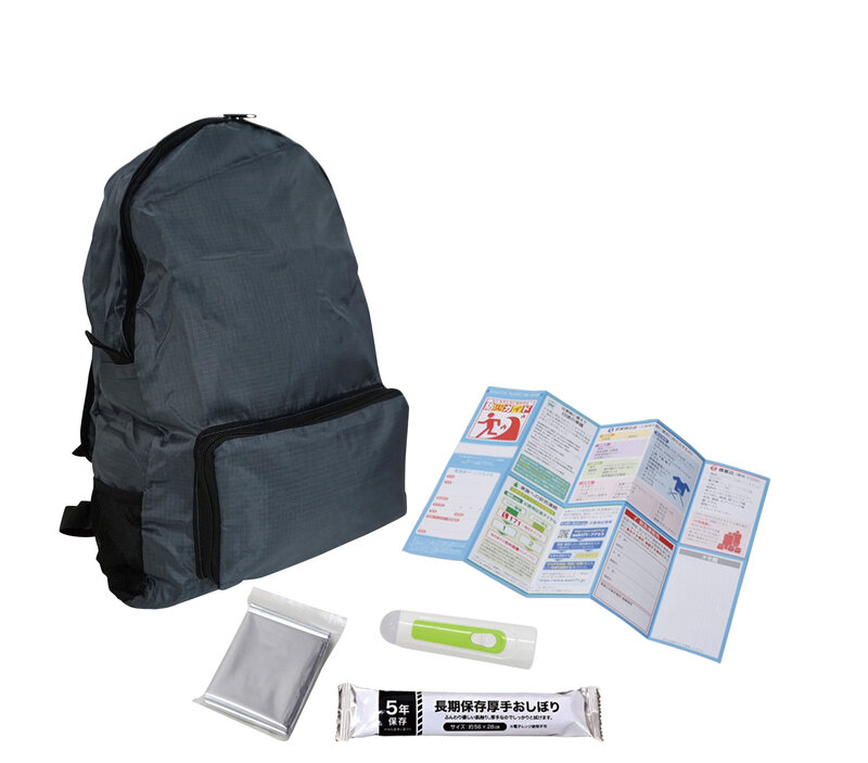 折りたたみ携帯リュック(420×320×150mm)・ハンディライト・大判厚手おしぼり・防寒シート・防災ガイド