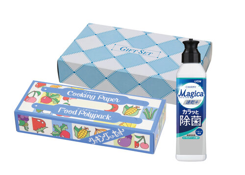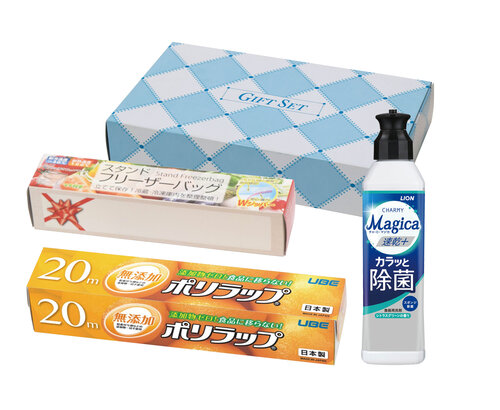 キッチンギフトセット 商品番号 MGS-900 ¥900(税別) 230059N405 ■セット内容 ポリラップ22cm×20m・ライオンチャーミマジカ220ml・フリーザーバッグ5枚入 ■箱サイズ 140×240×50mm 452g ■材質 ポリエチレン・界面活性剤 ■入数 40入(端数出荷可) …