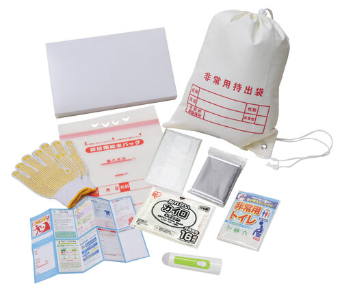 非常持出しセット商品番号 CL26-9 ¥2,000(税別) 262012N400 ■セット内容 チェックリスト付非常袋440×335mm・ハンディライト・非常用給水バッグ3L・非常用トイレ・防寒シート・すべり止め手袋・カイロ・マスク・防災ガイド ■材質 ポリエステル(非常袋) ■箱サイズ 315× …