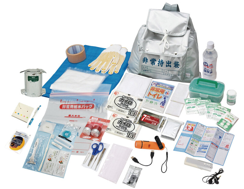 | ■セット内容 | 難燃性リュック型非常袋(400×380×80mm)・スマホ充電ダイナモライト・コンパクトFMラジオ・非常用ローソクセット・非常用給水バッグ5L・非常用トイレ・備蓄トイレットペーパー・防災用ウエットティッシュ・防寒シート・ホイッスル・すべり止め手袋・ゴミ袋45L(10L)半透明・ブルーシート2畳用・布テープ・付箋メモ・ボールペン・救急箱・カット綿×3枚・カットガーゼ×3枚・包帯・救急絆創膏2サイズ×3枚・サージカルテープ・清浄綿2枚入×3包・ハサミ・ピンセット・耳かき・毛抜き・宿泊セット用ポーチ・カミソリ・歯ブラシセット・二つ折りコンパクトブラシ・シャンプー&コンディショナー・石鹸・タオル・ヘアーバンド・カイロ2個・マスク2枚・ポケットティッシュ2個・安眠セット(アイマスク)・安眠セット(耳栓)・防災ガイド・保存水500ml |