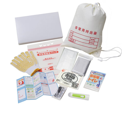 非常持出しセット 16点 商品番号 NK26-16 ¥3,000(税別) 261022N405 ■セット内容 反射テープ付非常袋(440×380mm)・ハンディライト・非常用給水バッグ5L・非常用トイレ・防災用ウエットティッシュ・防寒シート・軍手・ロープ3m・笛・付箋メモ・ボールペン・救急絆創膏2 …