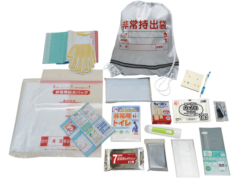 | ■セット内容 | 反射テープ付非常袋(440×380mm)・ハンディライト・非常用給水バッグ5L・非常用トイレ・防災用ウエットティッシュ・防寒シート・ホイッスル・すべり止め手袋・ゴミ袋45L(10枚入)半透明・レジャーシート1畳用・付箋メモ・ボールペン・圧縮袋・救急絆創膏2サイズ40枚入・カイロ・マスク・タオル・防災ガイド |