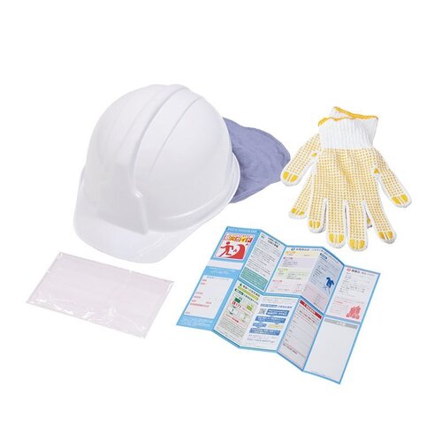 防災用ヘルメットセット 商品番号 BH26-4 ¥4,500(税別) 260056N405 ■セット内容 防災用ヘルメット(たれ覆い付)・すべり止め手袋・マスク・防災ガイド ■材質 ヘルメット:ABS樹脂、ポリエチレン ■箱サイズ 280×225×180mm ■重量 箱入643g(1セット) 1c/ …