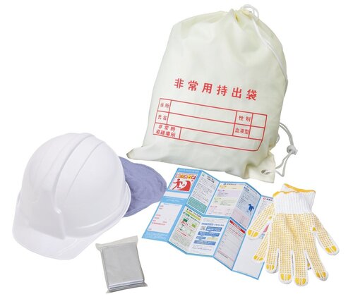 防災用ヘルメットセット 商品番号 BH26-5 ¥5,000(税別) 260063N405 ■セット内容 防災用ヘルメット(たれ覆い付)・チェックリスト付非常袋・防寒シート・すべり止め手袋・防災ガイド ■材質 ヘルメット:ABS樹脂、ポリエチレン、綿 ■箱サイズ 280×225×180mm ■重量 …